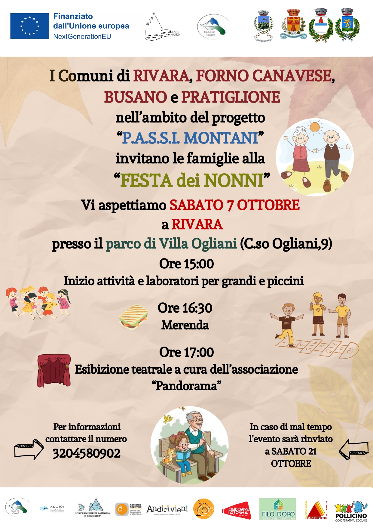 I Comuni di Rivara, Forno C.se, Busano e Pratiglione, nell'ambito del progetto "P.A.S.S.I. MONTANI" invitano le famiglie alla FESTA DEI NONNI che si terrà nel Parco di Villa Ogliani.