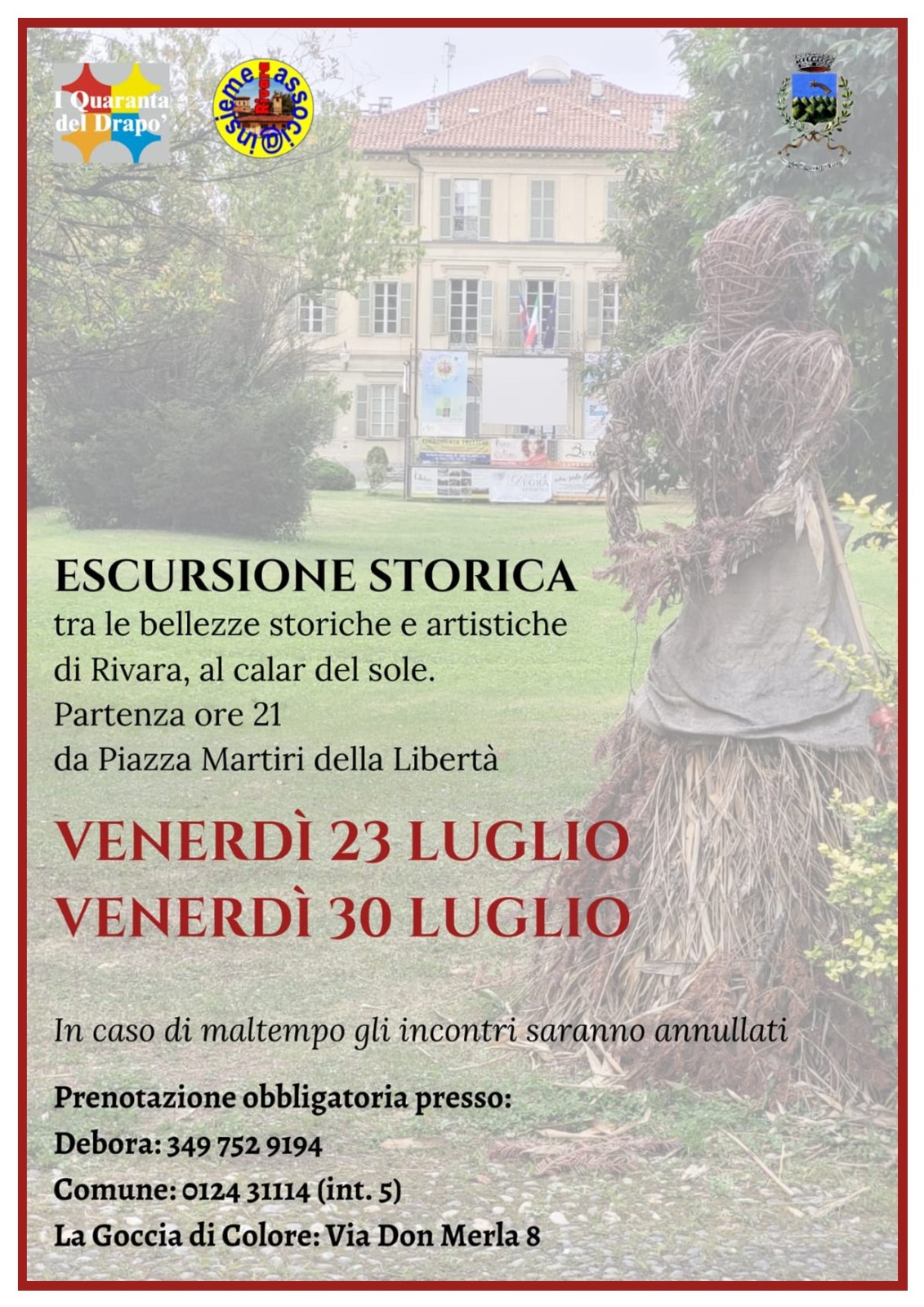 Venerdì 30 – “ESCURSIONE STORICA tra le bellezze storiche e artistiche di Rivara al calar del sole” con partenza ore 21,00 da Piazza Martiri della Libertà. Prenotazione obbligatoria presso Debora Mossino: 349 7529194 o Comune 0124 31114 (int. 5)