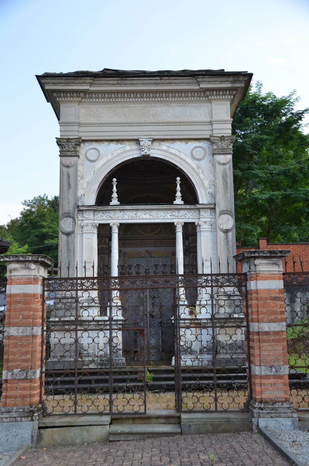 All’interno del mausoleo si accede attraverso una bellissima e monumentale cancellata in ferro battuto, finemente lavorata, opera del fabbro Domenico Bruno che, sotto l'ispirazione del D'Andrade fece un’opera di pregevole valore artistico. La cancellata termina con lavorazioni a foglie di acanto e nella parte centrale presenta un Cristo sulla croce che risulta essere di pregevole maestria.