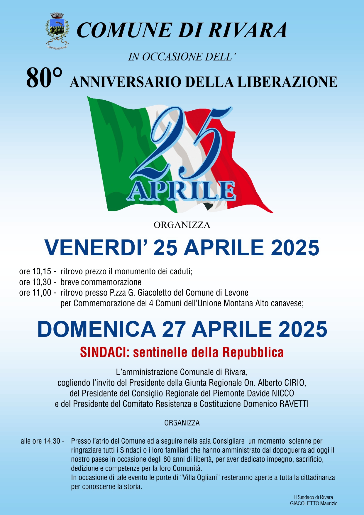 In occasione della celebrazione dell’80° anniversario della Liberazione dell’Italia dal nazifascismo, così come suggerito dalla Regione Piemonte, il Comune di Rivara aderisce all’iniziativa di aprire le porte del Palazzo Comunale ai cittadini per una visita durante la quale sarà possibile far conoscere la storia dell’edificio, in data 27 aprile 2025.