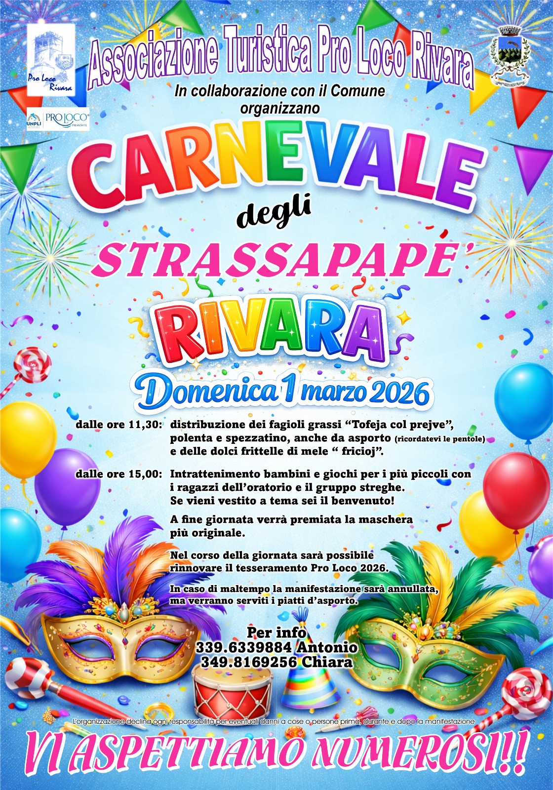Carnevale organizzato dalla Pro Loco di Rivara con distribuzione di polenta e spezzatino, tufeja e frittelle di mele e intrattenimento per bambini.