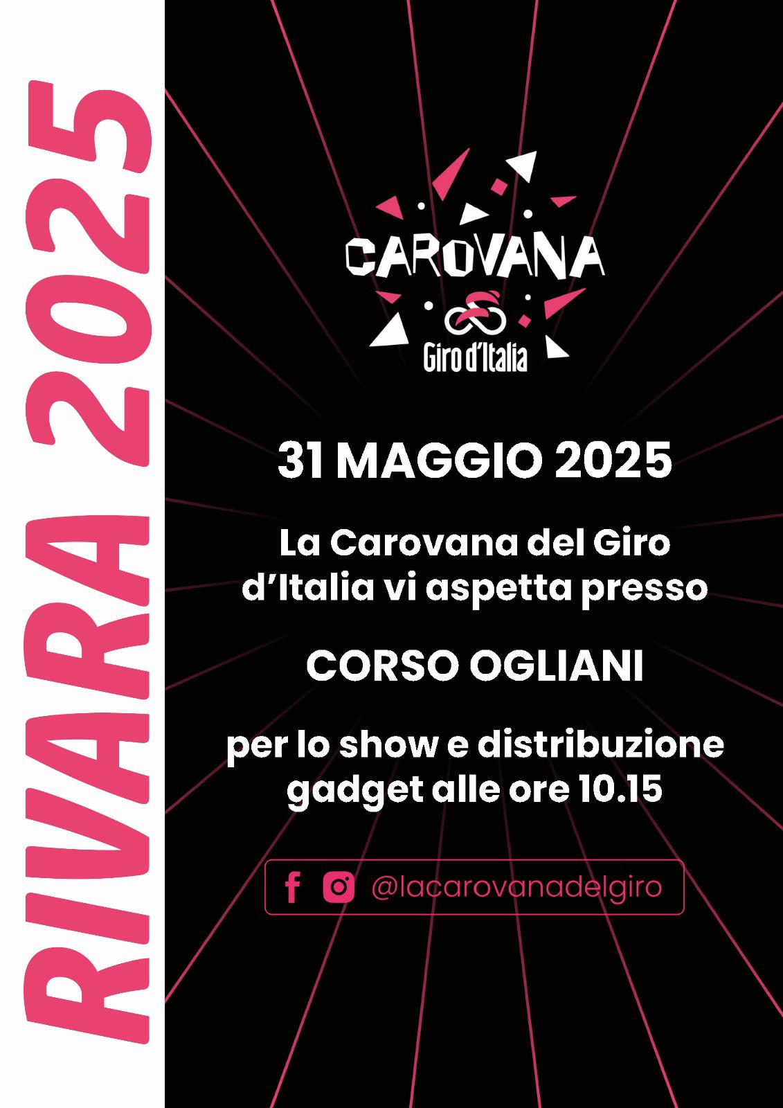 In occasione della 20° tappa "Verres - Sestriere", la Carovana del Giro d'Italia si ferma a Rivara in Corso Ogliani per lo show e la distribuzione di gadget dalle ore 10.15