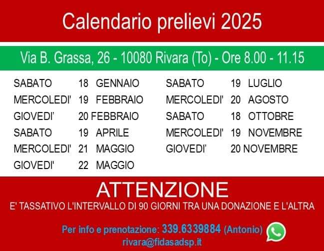 | Modalità di accesso | La sede dell'associazione è in Via B.Grassa n. 26, le date dei prelievi sono indicate nel calendario allegato |